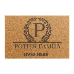 Welcome guests with a warm, grounded entrance. This coir doormat blends natural texture with a refined, family-name motif — a wreath and monogram sit above subtly stenciled lettering that reads like a quiet announcement of home. Fibrous coconut coir bristles scrape dirt and mud from shoes while the black vinyl backing keeps the mat firmly anchored on porches and stoops. It arrives ready to use, made with care in the USA from globally sourced parts, and settles into everyday life: muddy boots after a hike, quick towel-off after gardening, or a steady landing spot during busy comings and goings. The look is classic and understated, speaking to homeowners who value durable, eco-conscious details and a welcoming first impression.